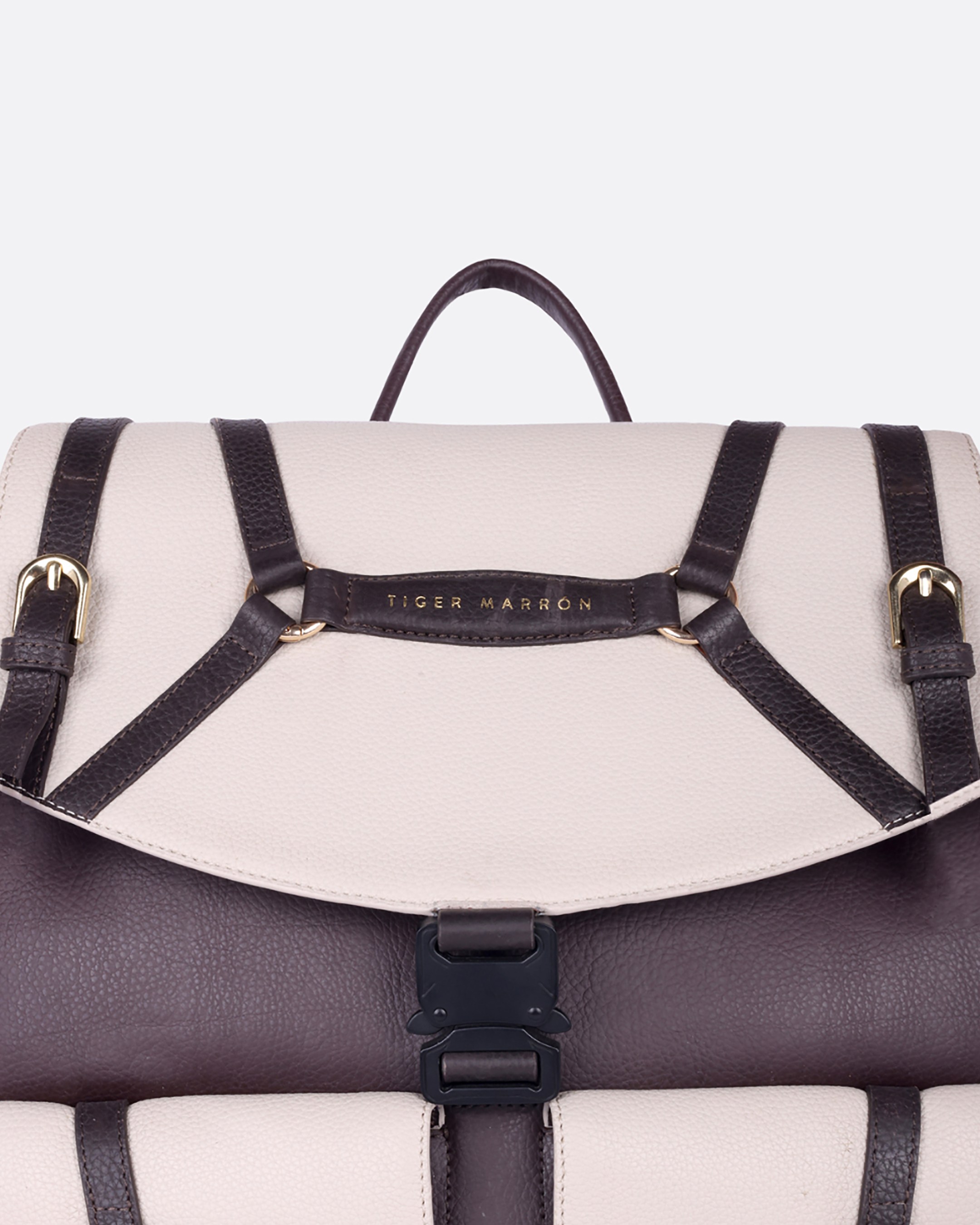The lusitano backpack is a white and brown canvas backpack with adjustable shoulder straps and multiple compartments for organized storage. It features durable construction with reinforced stitching and metal hardware that ensures long lasting use. Designed for daily commuting or travel, it offers both style and functionality for everyday adventures.