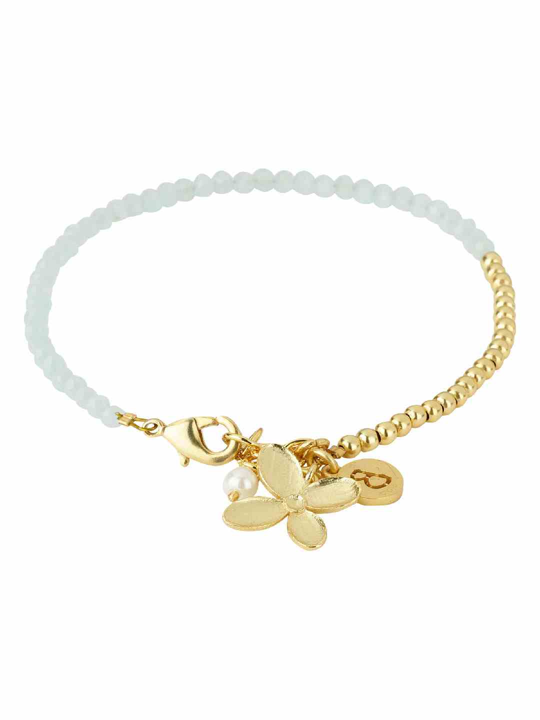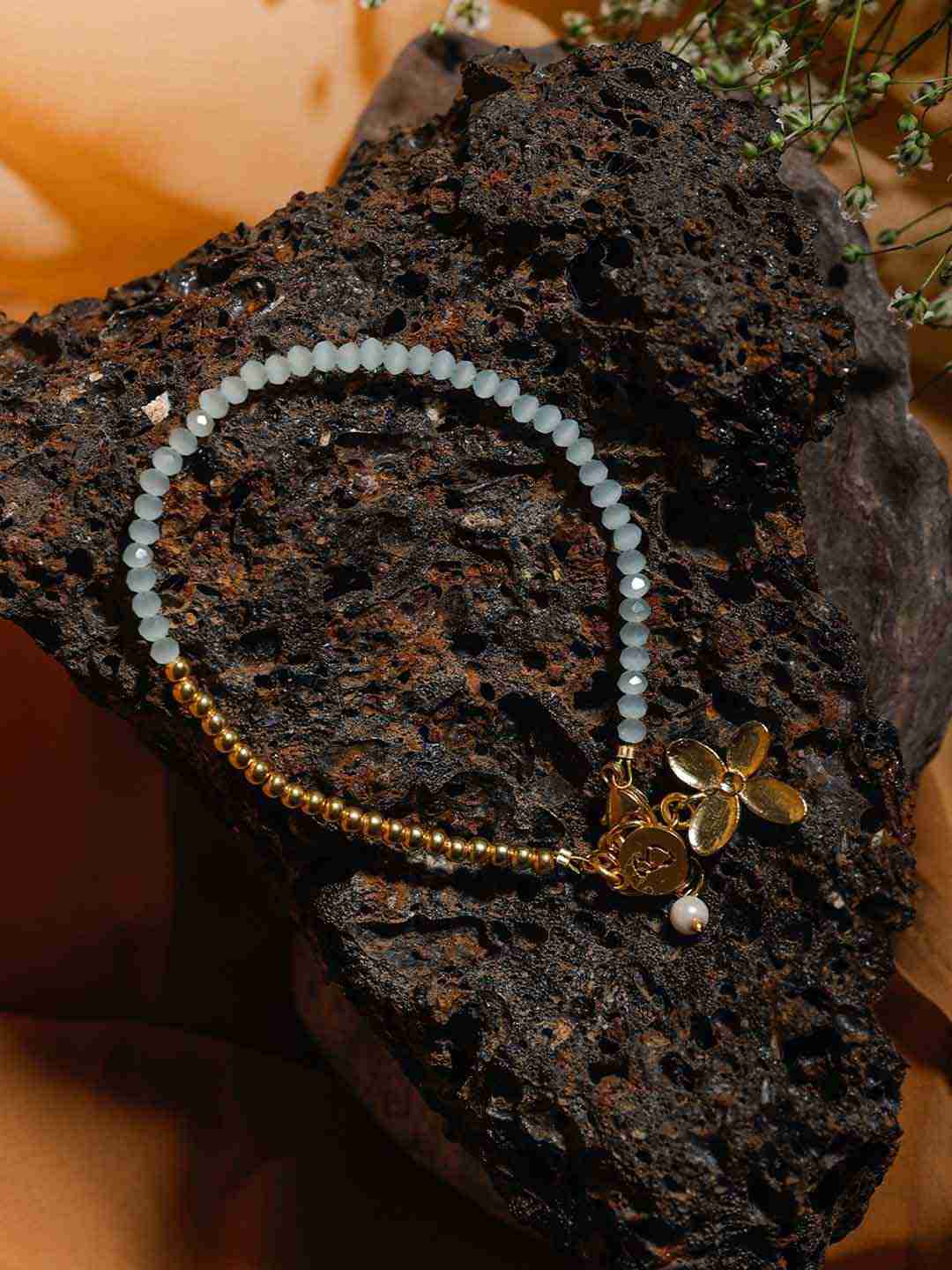 The Floral Charm Aquamarine Bracelet by Berserk is a boho-chic accessory that combines brass and gold plating with aquamarine gemstones, promoting calmness and emotional balance. Its floral design adds a touch of nature-inspired elegance to any outfit.