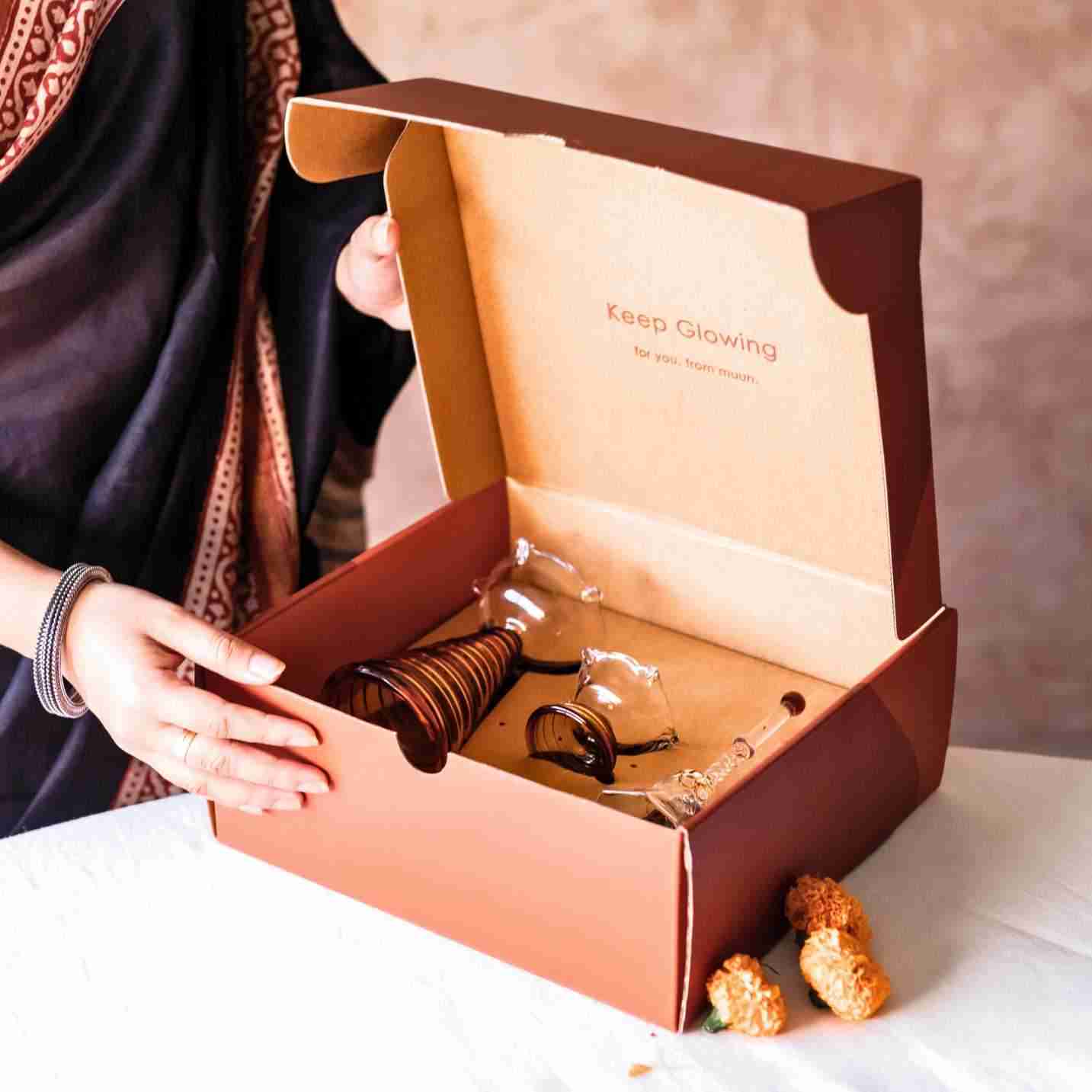 Glass Festive Gift Box - Tall Diya + Short Diya + Bell - Amber