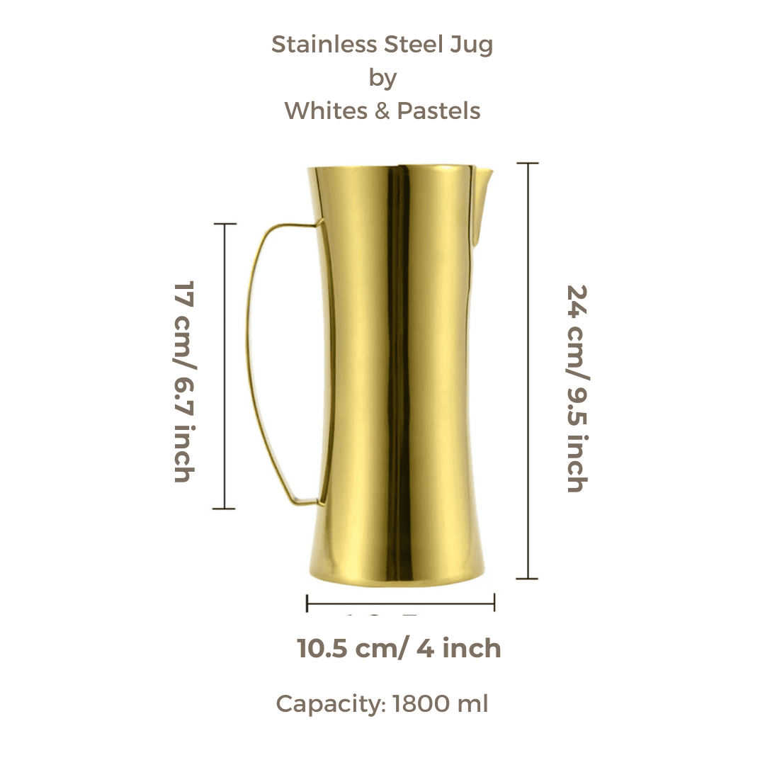 Elevate your serving game with Whites & Pastels' Luxury Gold Stainless Steel Water Jug & Carafe. Crafted from premium food-grade stainless steel, it boasts a radiant gold PVD mirror finish on the outside and a sleek silver interior. With a generous 1.8L capacity, this jug is perfect for serving water, juices, cocktails, or hot beverages, making it a versatile addition to any gathering. Its non-reactive interior ensures safety for all drinks, including acidic ones like lemon water, while the elegant design adds a touch of sophistication to your table setting.