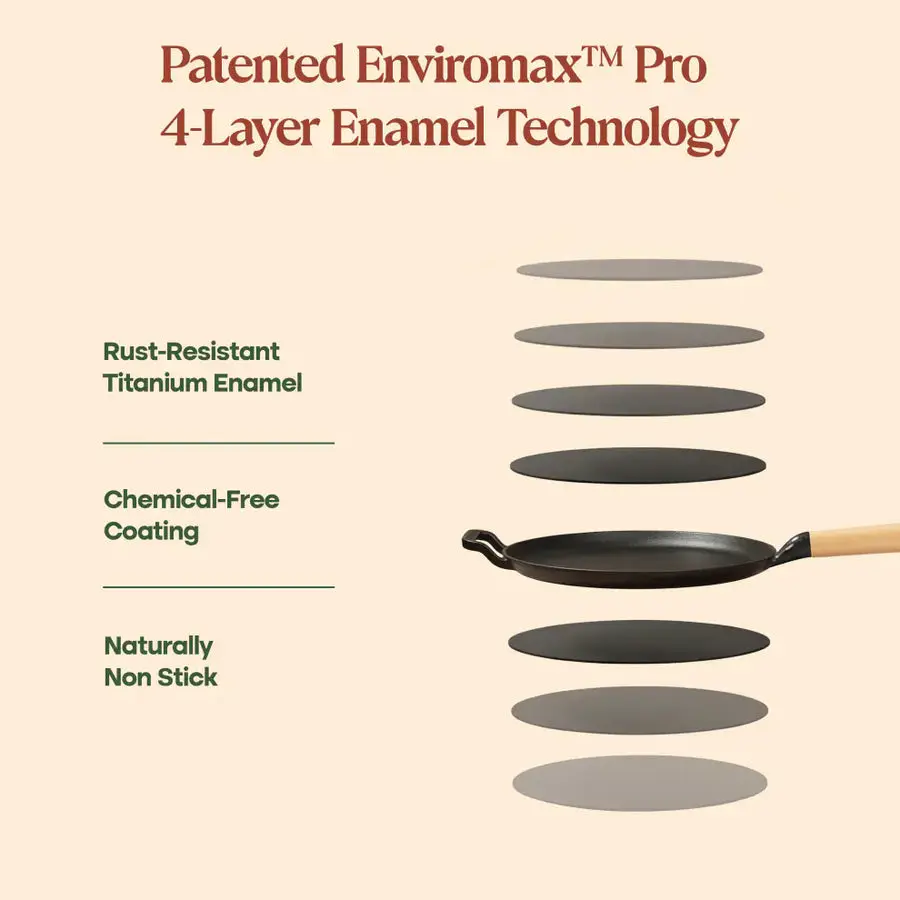 The No. 11 Enamel Cast Iron Dosa Tawa is a thoughtfully crafted kitchen essential designed for effortless, even cooking. Made from durable cast iron and finished with a smooth enamel coating, it delivers consistent heat distribution for perfectly crisp dosas, cheelas, pancakes, and more. Balancing traditional performance with modern convenience, this tawa is sturdy, reliable, and easy to maintain—making it a timeless addition to everyday cooking routines.