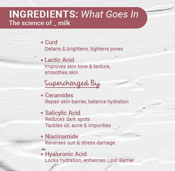 Active ingredients like lactic acid, niacinamide, hyaluronic acid, and salicylic acid for tone, texture, hydration, and acne control.
