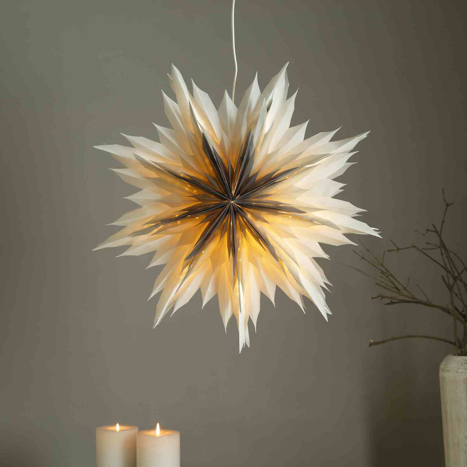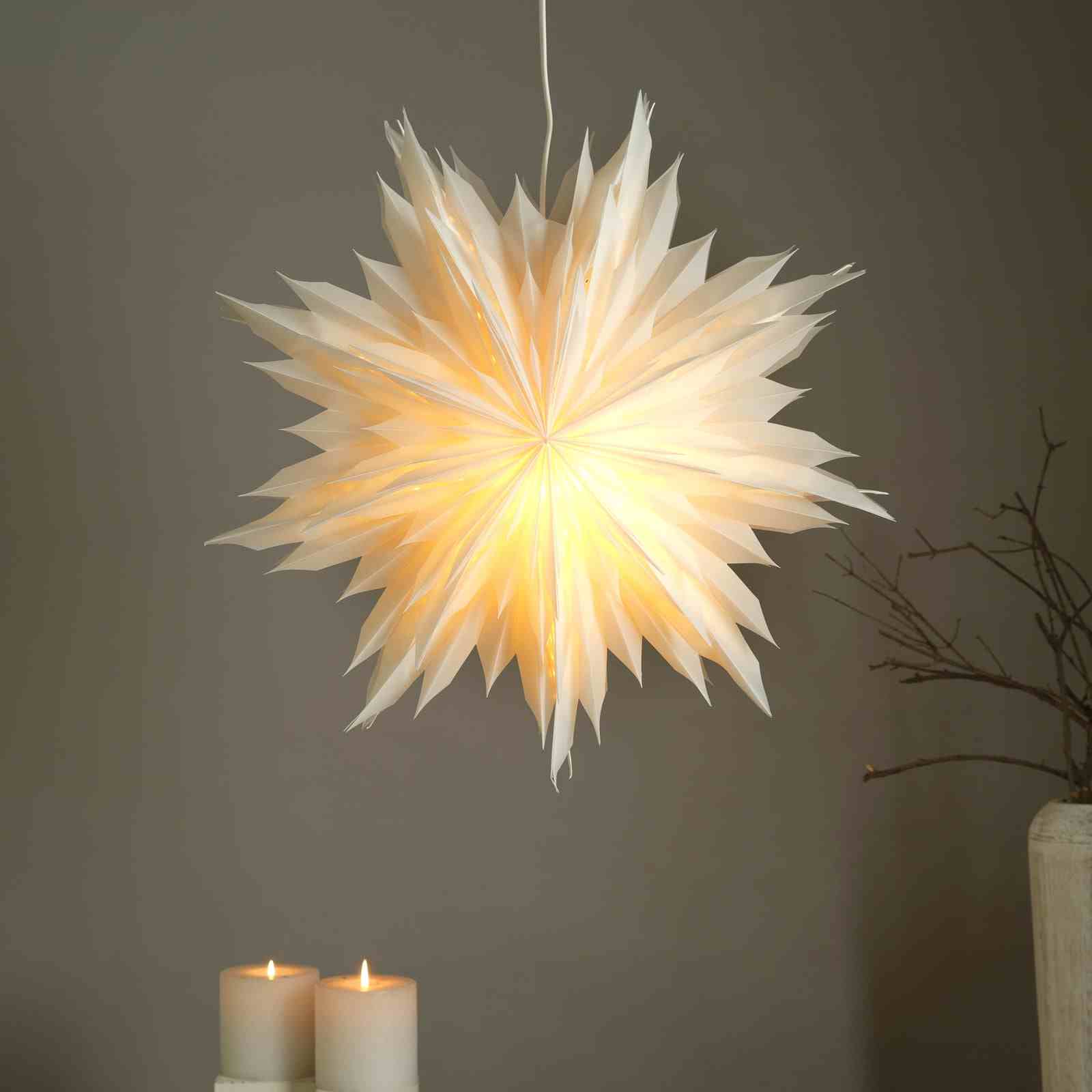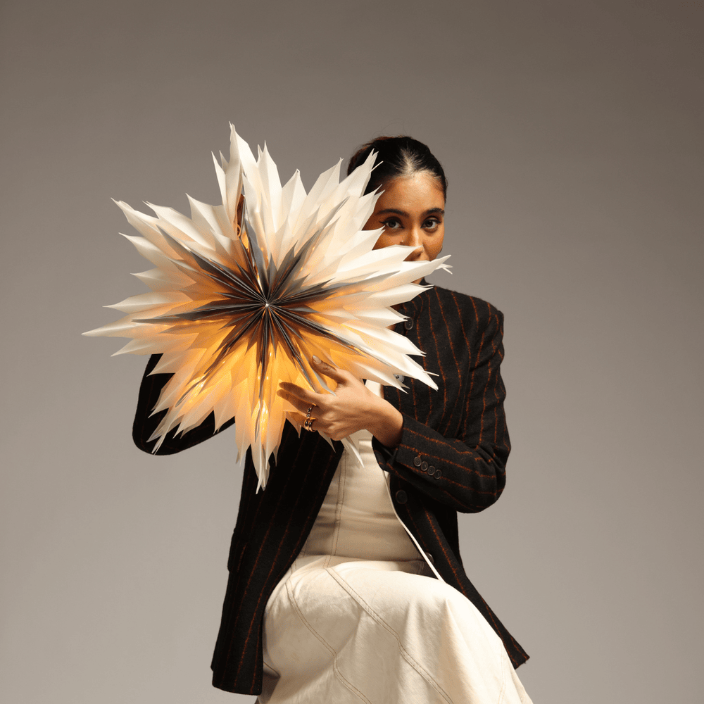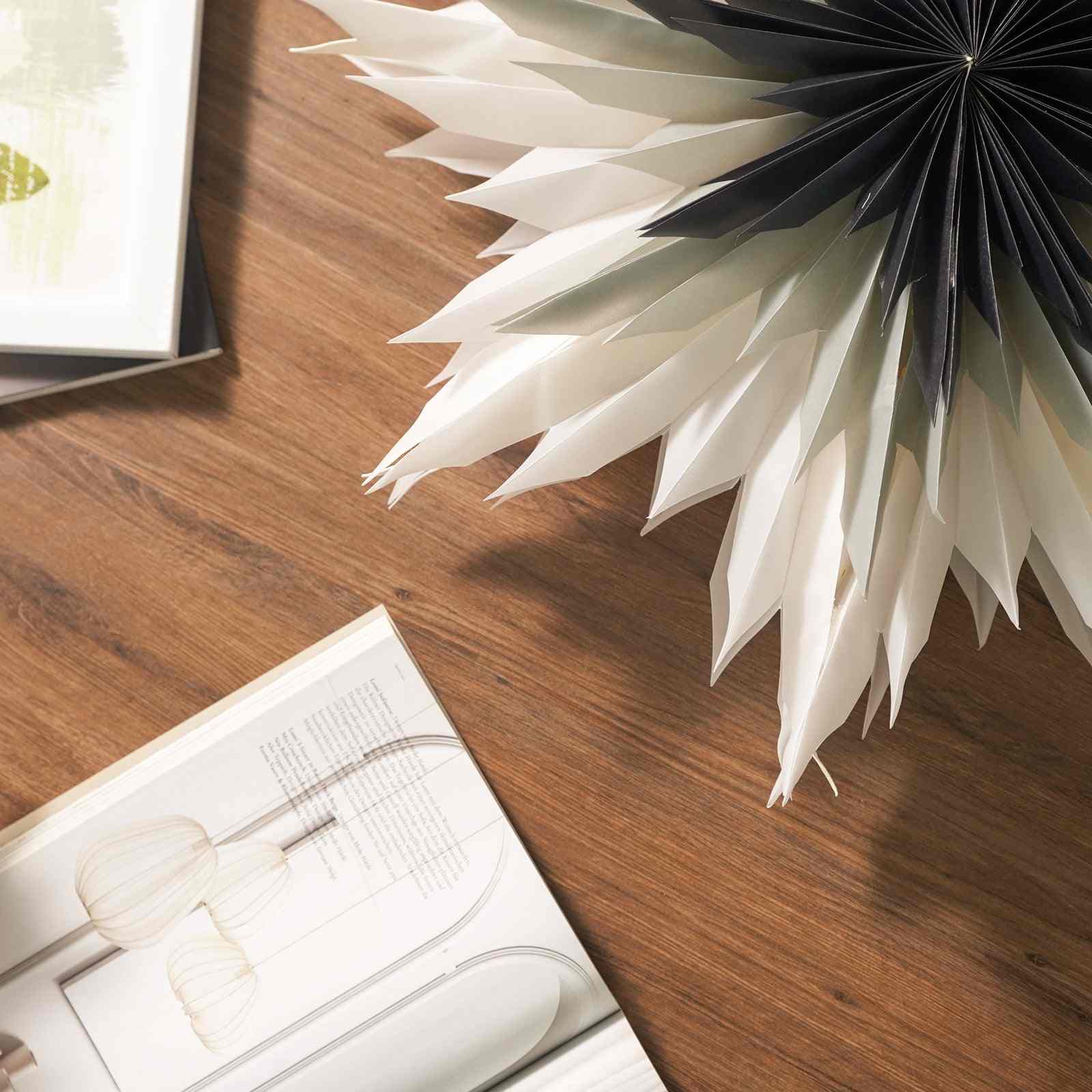 Design: Features a folded origami-inspired form resembling a snowflake flower, designed to diffuse light softly and evenly.