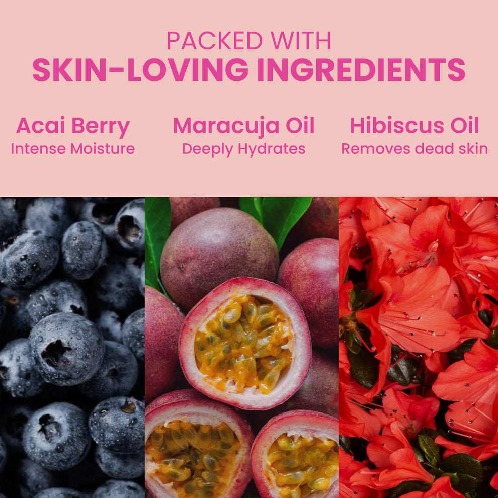 Key ingredients include: Acai Berry Oil, Hibiscus Oil, Maracuja Oil.