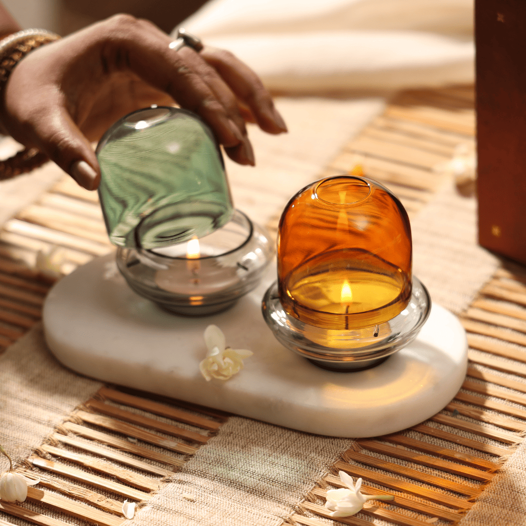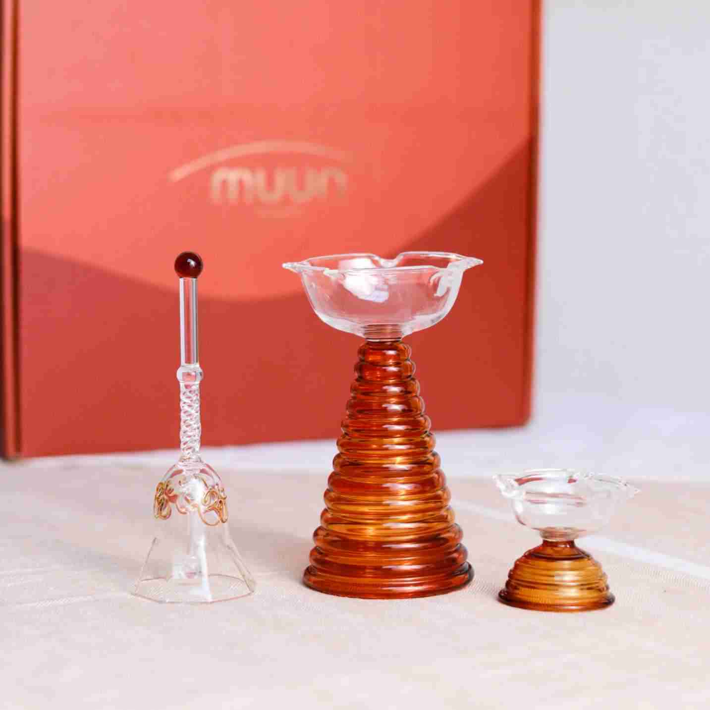 Glass Festive Gift Box - Tall Diya + Short Diya + Bell - Amber
